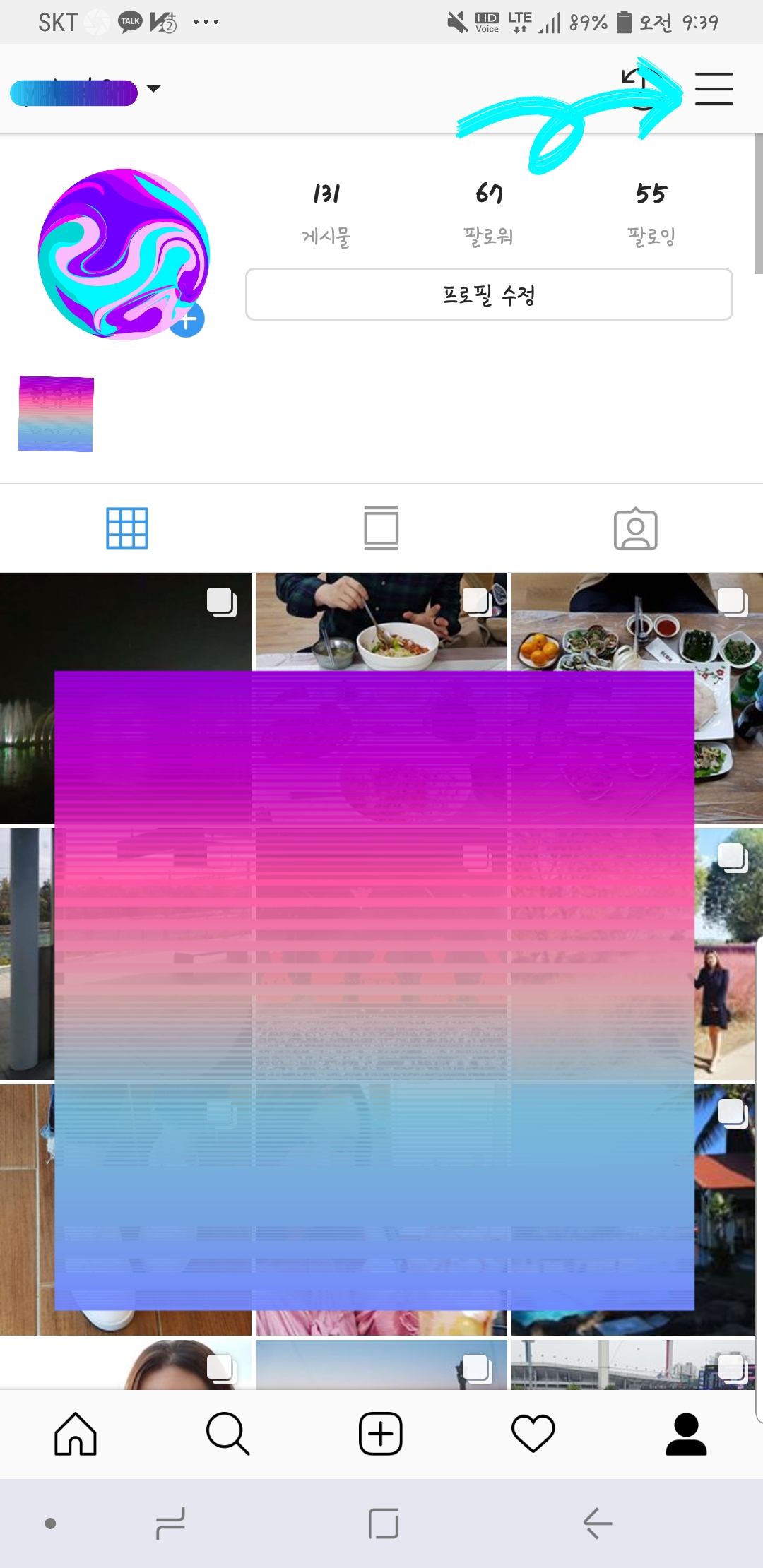1. 인스타 로그인 후 상단 우측 메뉴 클릭