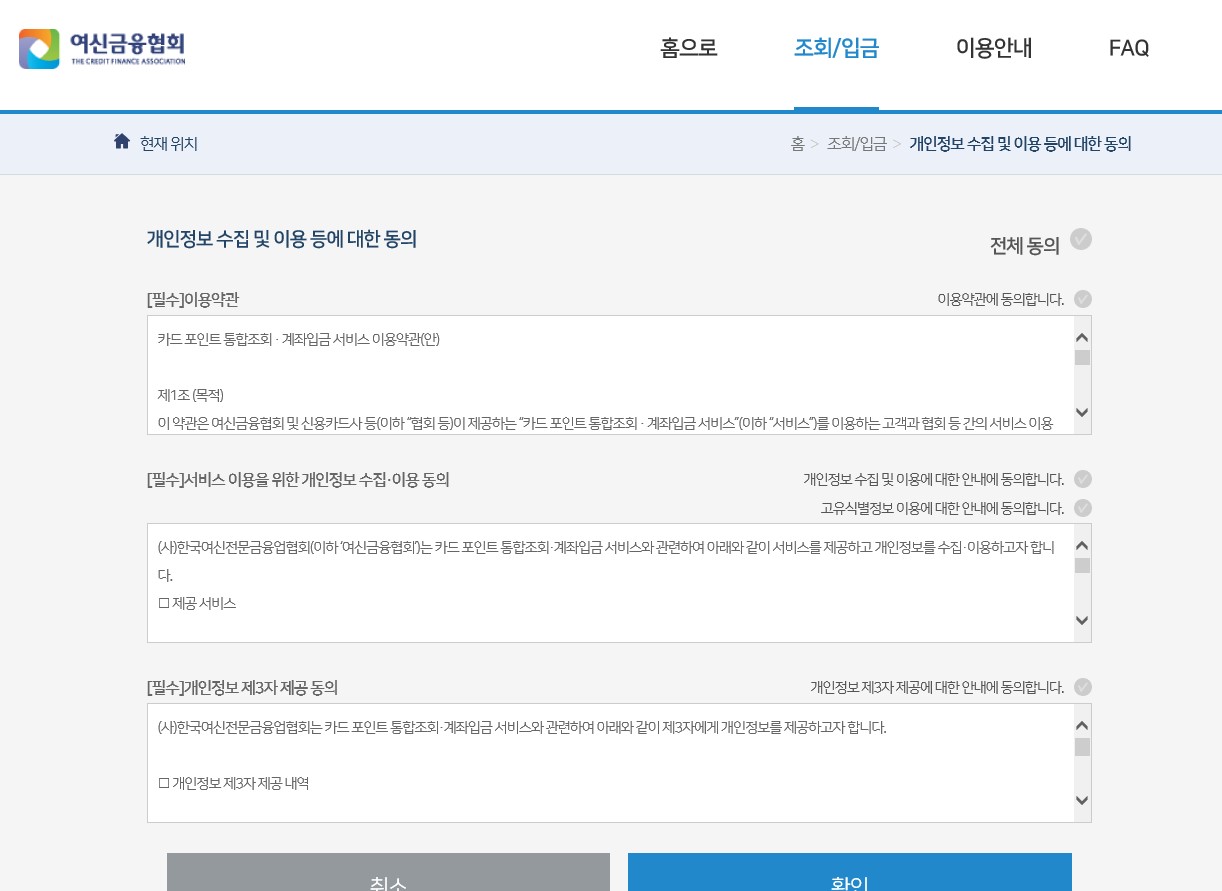 개인정보 수집 및 이용 등에 대한 동의 > 우측에 있는 전체 동의 선택 후 하단에 있는 확인 버튼을 눌러주세요.