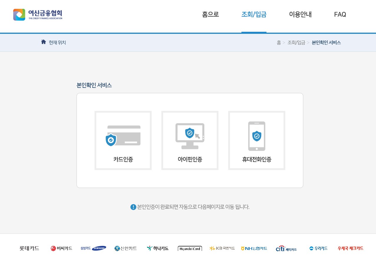 방법은 카드인증/아이핀인증/휴대전화인증 3가지 중 편한 것으로 선택하시면 됩니다.